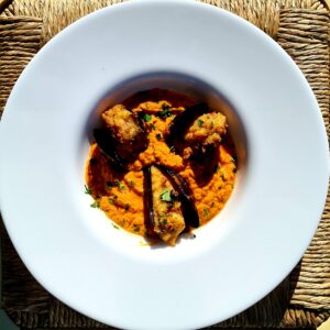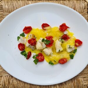 Filetto di baccalà su vellutata di patate e pomodoro
