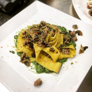 Salmone su vellutata di zucca cipolla caramellata e rucola fritta