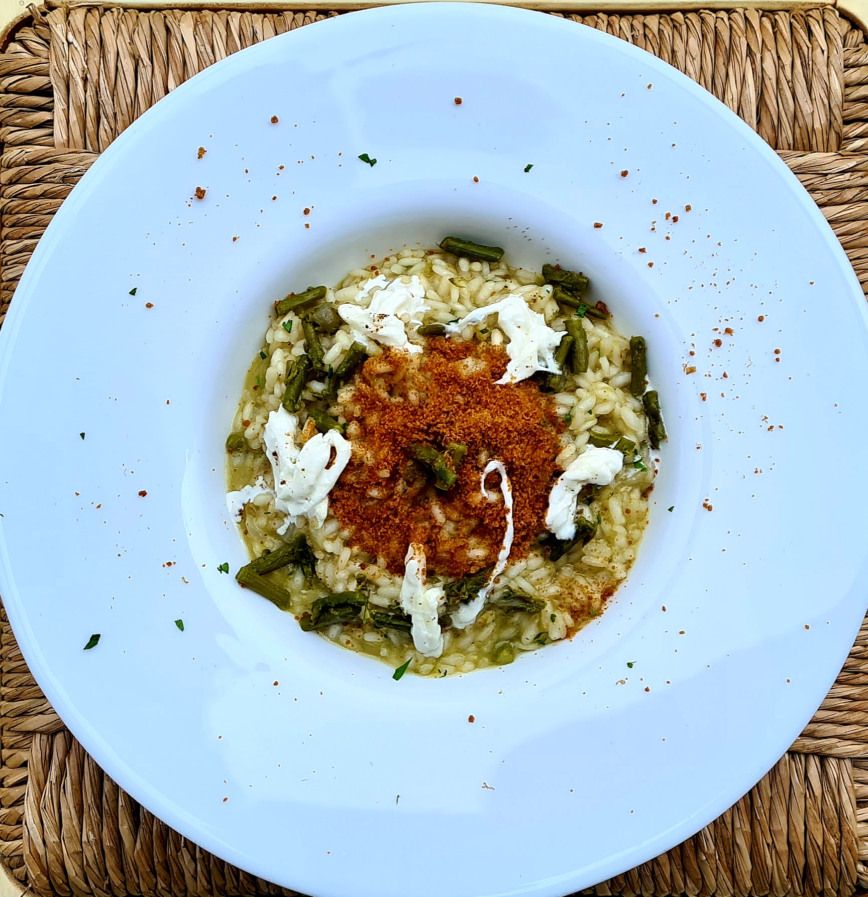 Riso carnaroli, brodo vegetale, asparagi, bottarga di tonno, olio evo e stracciatella