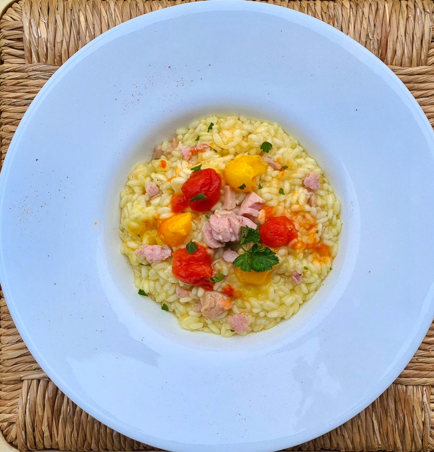 Riso carnaroli, brodo vegetale, pomodori, tonno fresco, pepe, origano e olio evo