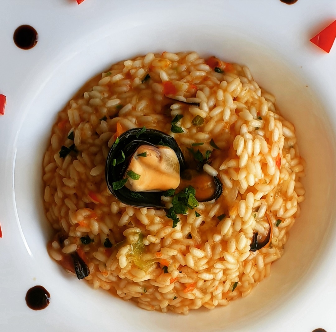 -Risotto con crema di peperoni e cozze