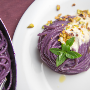 Tonnarello con crema di cavolo rosso burrata e pistacchio